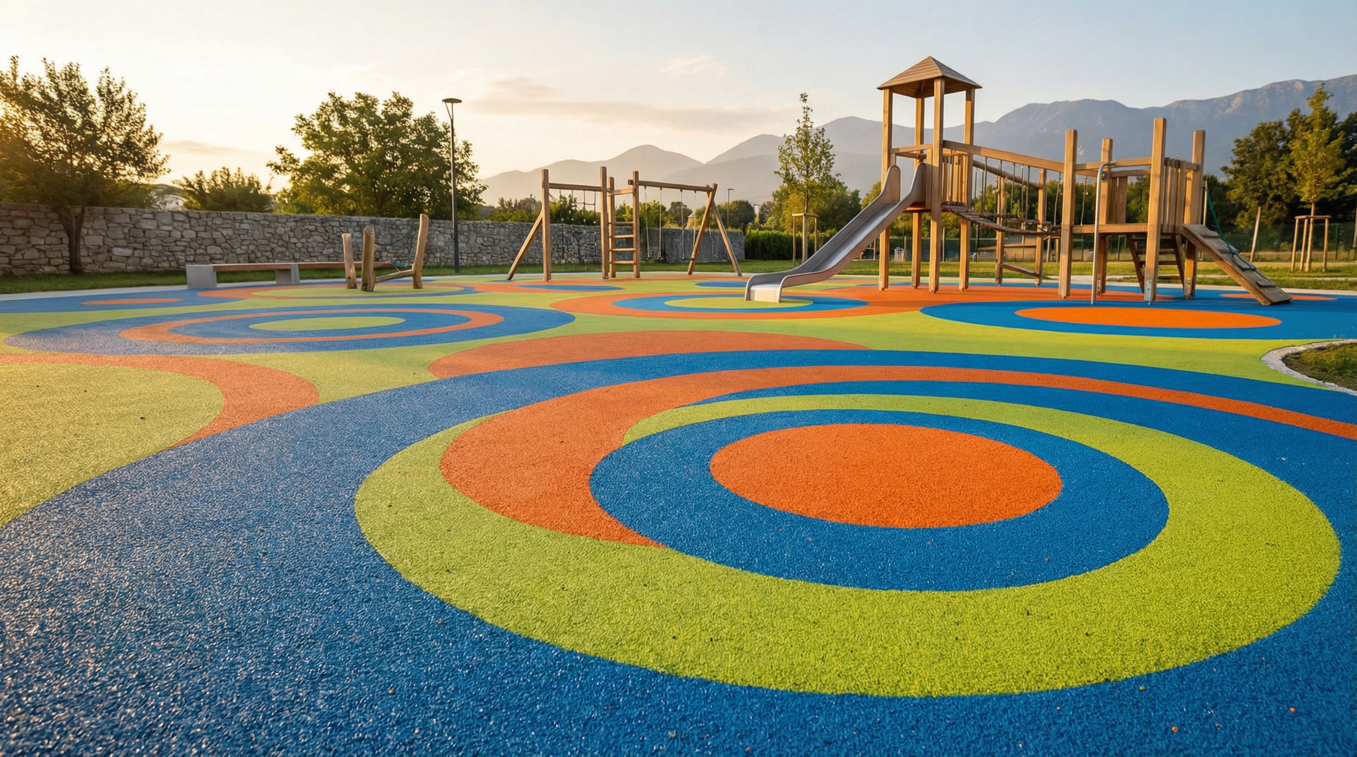 На детских площадках резиновые настилы из EPDM превращаются в яркие дизайнерские полы. Ведь цветная крошка позволяет создавать красочные и «весёлые» дизайны.